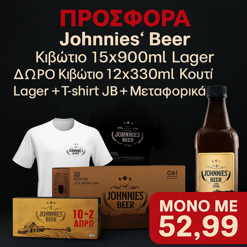 Προσφορά Johnnies’ Beer –Κιβώτιο 15×900 ml Lager φιάλη με Δώρο Κιβώτιο 12×330 Lager κουτάκι , T-Shirt & Μεταφορικά